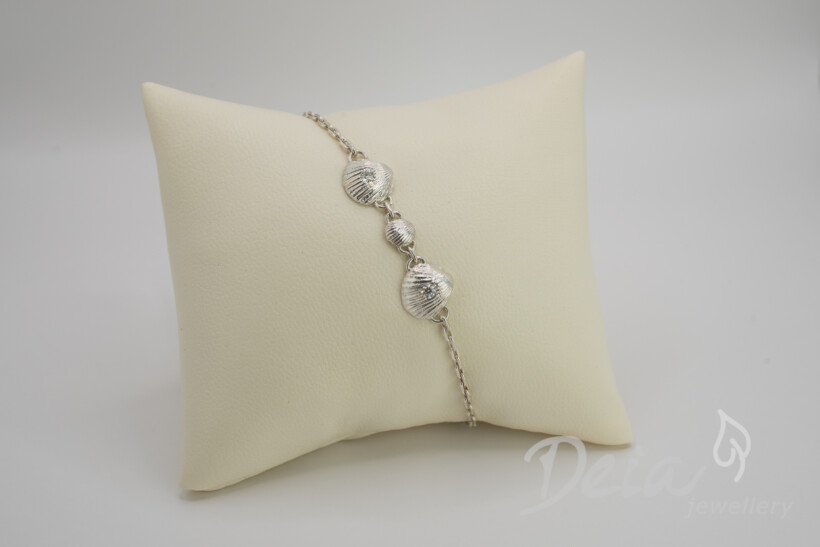 Náramok „Lastúra“ spája tri jemné lastúrky s iskrou moissanitu do kompozície, ktorá zachytáva pokoj letného pobrežia.